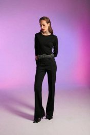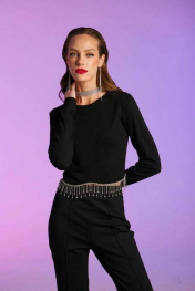 Джемпер из вывязанных деталей, из тонкой пряжи, прямого силуэта, укороченный, длиной до линии талии, с рукавами длиной до запястья. Горловина округлой формы. Низ переда фигурный с пришивными стразами.