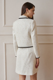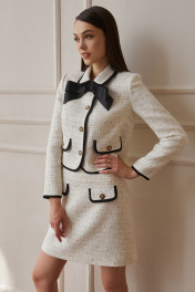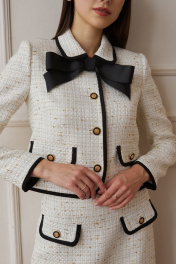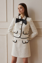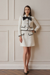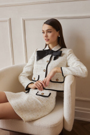 Костюм из мягкой костюмной ткани «рогожка» с контрастной отделкой и фурнитурой. Жакет укороченный, длиной чуть ниже талии, прямого силуэта, с втачными двухшовными рукавами длиной до запястья, рубашечным воротником на круглой горловине, с центрально-бортовой застёжкой на четыре петли и пуговицы. Детали переда с нагрудными вытачками из боковых швов, с накладными клапанами на уровне талии. Спинка со средним швом. По контуру клапанов, воротника, бортов, низа, низа рукавов притачные отделочные детали из контрастной ткани, шириной около одного сантиметра. Жакет на подкладке. На уровне верхней пуговицы съёмный бант-брошь. Юбка трапециевидного силуэта, с посадкой на талии, на обтачке. Юбка длиной выше линии колена. Передняя часть с накладными клапанами с застёжкой на петлю и пуговицу. Задние половинки с талиевыми вытачками и застёжкой на тесьму-молнию в среднем шве. Юбка на подкладке.