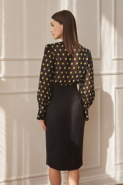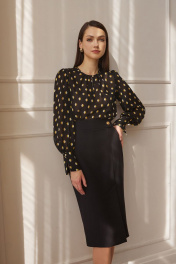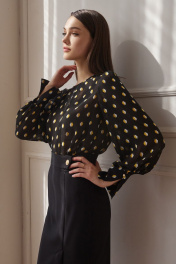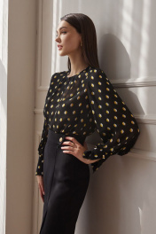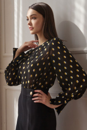 Блузка из шифона с содержанием 100% вискозы, с дизайном ромбы, прямого силуэта, длиной до линии бёдер, с рубашечными рукавами, с округлой горловиной. Рукава длиной до запястья. Детали переда со средним швом, с двумя парами складок по краю горловины, ребро складок направлено к центру. Спинка без особенностей. Рукава со сборкой по окату, с двумя парами складок по шву притачивания манжет, разрез рукавов окантован. Манжеты высокие, трапециевидной формы, застёжка манжет на петлю и пуговицу на небольшом уступе. Горловина окантована, с застёжкой на навесную петлю и пуговицу.