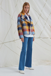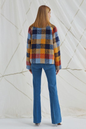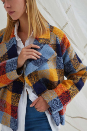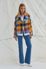 Полупальто из мягкой пальтовой ткани «букле» с дизайном крупная клетка, свободного кроя «оверсаиз», прямого силуэта, длиной чуть выше линии бёдер. Рукава-реглан длиной до запястья. Воротник пиджачного типа расширен по отлёту и по уступу лацкана, концы воротника стачиваются с лацканом по уступу. Детали переда с наклонными карманами с листочкой. Спинка без особенностей. Застёжка центральная двубортная на четыре петли и пуговицы. Полупальто на подкладке.