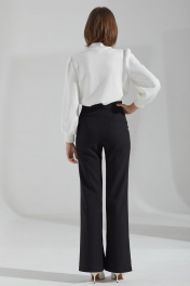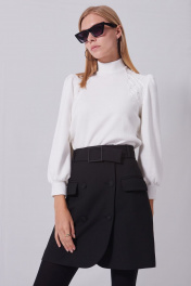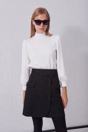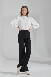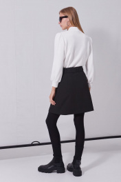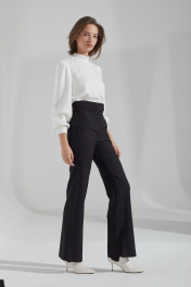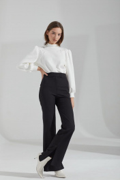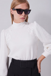 Джемпер из мягкого трикотажного полотна, длиной до линии бёдер, прямого силуэта, рукава втачные, одношовные, длиной до запястья. Воротник-стойка на круглой горловине. Передняя часть с художественной вышивкой от плеча до проймы с двух сторон. Рукава со сборкой по окату и по шву притачивания манжет. Низ прямой.