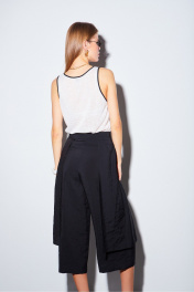 Блузка из тонкого трикотажного полотна, длиной выше линии бёдер, прямого силуэта, горловина округлой формы. Перед и спинка без особенностей. Горловина и проймы окантованы контрастной тканью. Низ блузки прямой с небольшими разрезами по боковым швам.