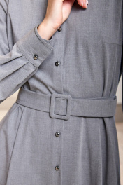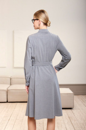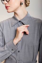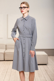 Платье из тонкой ткани костюмно-плательного ассортимента, отрезное по талии, верхняя часть полуприлегающего силуэта, нижняя – А-силуэта. Платье длиной ниже середины икры, с рубашечным воротником, с рукавами длинной до запястья. Застёжка центральная на петли и пуговицы на цельнокроёной планке. На талии съёмный пояс из основной ткани с обтяжной прямоугольной пряжкой. Лиф платья с нагрудными вытачками из боковых швов, спинка с плечевыми и талиевыми вытачками. Нижняя часть платья со складками по центру деталей переда и прорезными наклонными карманами с листочкой на уровне бёдер. Рукава с двумя парами складок по шву притачивания манжет, застёжка манжет на петлю и пуговицу. Низ платья прямой. По контуру воротника и манжет проложена отделочная строчка люрексовой ниткой.