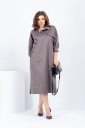 Платье женское свободного плкроя из хлопковой ткани. Вырез горловины оформлен воротником рубашечного типа с отрезной стойкой. Рукава - со спущенной линией плеча и отложными манжетами внизу. Застежка - отрезная планка асимметричной формы на петли с пуговицами. На левой части передней половинки - декоративный клапан. В левом боковом шве- карман. Внизу платья - разрезы в боковых швах. Длина изделия- 1.15 м.