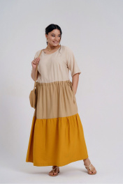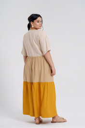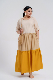 Платье женское свободного силуэта из ткани трех цветов. Вырез горловины округлой формы. Рукав отрезной на базе цельнокроеного, короткий. Перед и спинка разделены на ярусы с сборкой. По линии талии кулиса, которая позволяет регулировать прилегание силуэта. В боковых швах функциональные карманы.