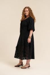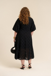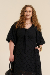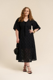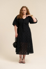 Платье женское приталенного силуэта из хлопковой ткани с вышивкой ришелье на подкладке. По линии талии- отрезное. Низ изделия состоит из клиньев. Вырез горловины- углубленный, V-образной формы. Декорирован обтачной лентой в виде завязки. Рукава- реглан формы баллон. Застежка- потайная молния на спинке в области горловины. В боковых швах имеются карманы.