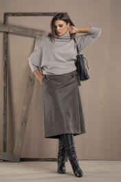 Комплект женский двухпредметный. Джемпер- асимметричный свободного покроя из мягкого трикотажного полотна. Вырез горловины оформлен объемным воротником-стойкой. Рукава-ассиметричные цельнокроеные с широкими манжетами. Длина рукава о тлинии горловины-0.65 м. Длина спинки- 0.56 м. Юбка- расклешенная к низу из ткани "под кожу" на подкладке. Пояс- цельнокроеный на обтачке. Застежка- молния в среднем шве спинки. На передней части выполнена глубокая мягкая складка.Изделие дополнено съемным поясом из основной ткани. Длина юбки-0.79 м.