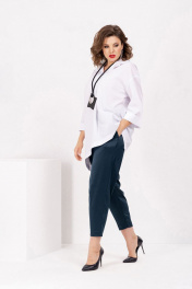 Комплект женский двухпредметный. Блузка свободного покроя из рубашечной ткани. Рукава- отрезные на базе цельнокроеных с манжетами. Вырез горловины оформлен воротником рубашечного типа. На передней половинке- мягкая, глубокая складка, имитирующая запах. На правой полочке блузки накладной карман.на спинке выполнен подрез с напуском, оформленным отделочной строчкой. Низ изделия ассиметричной формы. Длина спинки по среднему шву-77 см. Длина рукава от линии горловины-62 см. Брюки- свободного покроя, зауженные к низу. В боковых швах имеются карманы с отрезными бочками. Пояс- отрезной с эластичной тесьмой. Длина от линии талии с учетом пояса - 96 см. Комплект дополнен эксклюзивным кулоном ручной работы.