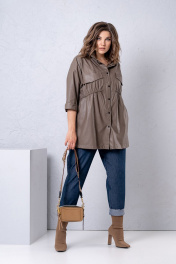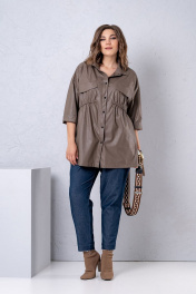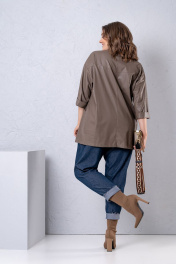 Комплект женский двухпредметный. Блузка- свободного покроя. Вырез горловины оформлен отложным воротником рубашечного типа с отрезной стойкой. На полочках - декоративные подрезы с отделочными строчками. В подрез по линии груди вставлены клапаны, по линии талии подрез декорирован эластичной тесьмой. В боковых швах имеются карманы с отрезным бочком. На спинке расположена фигурная кокетка. Застежка- на кнопки. Рукав слегка спущен. По бокам блузы - разрезы. Длина спинки- 79см., длина рукава от линии горловины - 60 см. Брюки- свободного покроя, зауженные к низу. В боковых швах имеются карманы с отрезным бочком. Пояс отрезной с эластичной тесьмой. По низу изделия пришита обтачка с необработанными краями. Длина от линии талии - 96 см.