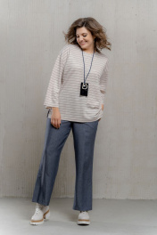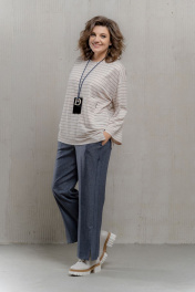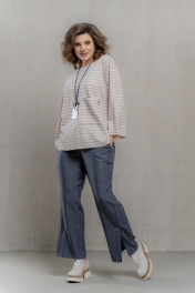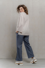 Комплект женский двухпредметный. Джемпер- свободного покроя из мягкого трикотажного полотна. Вырез горловины- неглубокий, округлой формы с отрезной планкой. Рукава- отрезные на базе цельнокроеных, слегка расширенные к низу. На полочке накладной карман. В боковых швах разрезы. Длина спинки- 63 см. Длина рукава от линии горловины-66см. Брюки полуприлегающего силуэта, прямые к низу. На передних половинках брюк - подрезы, в которых расположены функциональные карманы, по низу - шлицы. Пояс- отрезной с эластичной тесьмой, застежка - молния. Длина от линии талии с учетом пояса - 100 см. Комплект дополнен кулоном. Фурнитура может меняться.
