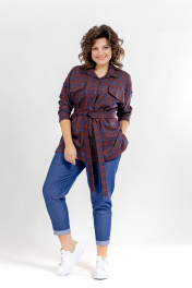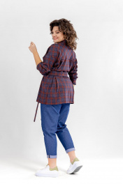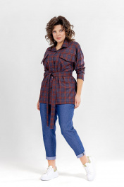 Комплект женский двухпредметный. Блузка- свободного покроя. Вырез горловины оформлен отложным воротником рубашечного типа с отрезной стойкой. Застежка- на петли с пуговицами. Рукава- на базе цельнокроенных. На спинке - отрезная кокетка. По переду накладные карманы с клапанами. В боковых швах небольшие разрезы. Длина спинки- 74 см, длина рукава от линии горловины - 73 см. Брюки- свободного покроя, зауженные к низу. В боковых швах имеются карманы с отрезным бочком. Пояс отрезной с эластичной тесьмой. Длина от линии талии - 94 см.