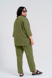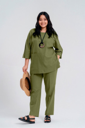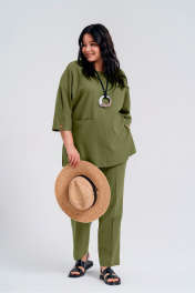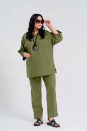 Комплект женский двухпредметный. Блуза свободного покроя. Вырез горловины неглубокий округлой формы. Рукава- отрезные на базе спущенного с декоративной складкой по низу. По переду разноуровневые подрезы с карманами, в боковых швах разрезы. Брюки свободного покроя с молнией, зауженные к низу. В боковых швах - карманы с отрезными бочками. Пояс- отрезной с эластичной тесьмой. Комплект дополнен дизайнерским кулоном.