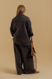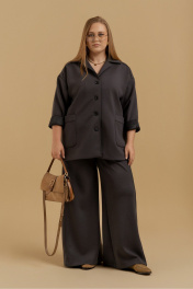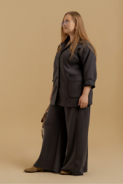 Комплект женский двухпредметный из трикотажного полотна с деталями из отделочной ткани. Жакет прямого силуэта. Вырез горловины оформлен воротником рубашечного . Застежка - однобортная на петли с пуговицами. Рукава - втачные, на базе цельнокроеных. На передних половинках имеются накладные карманы. Спереди и на спинке выполнены подрезы в виде кокеток. Изделие посажено на подкладку. Брюки прямого силуэта со смещенными вертикальными подрезами спереди. Пояс - отрезной с эластичной тесьмой без застежки. В подрезах имеются карманы. Есть шлевки для ремня.