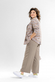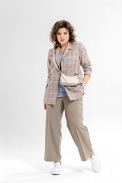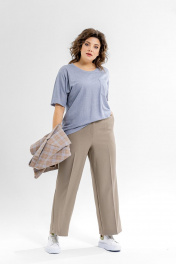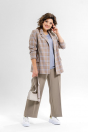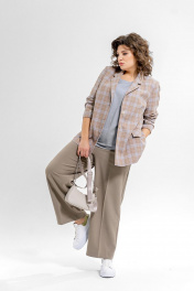 Комплект женский трехпредметный. Классический жакет свободного силуэта на подкладке. Воротник пиджачного типа, застежка на петли и пуговицы. На спинке шлица, на полочке прорезной карман в рамку с клапаном. Рукав втачной, по переднему шву со шлицей. Длина по спинке - 69см, длина рукава - 58см. Блуза свободного покроя со спущенным рукавом. Вырез горловины- неглубокий округлой формы. На полочке накладной карман. Длина по спинке - 64 см, длина рукава от горловины - 41 см. Брюки свободного покроя, прямые от бедра. В боковых швах карманы с отрезным бочком. Пояс отрезной с эластичной тесьмой, застежка на молнию и петлю с пуговицей. Длина с учетом пояса - 99 см