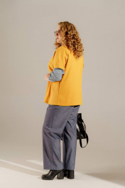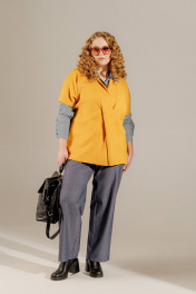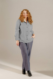 Комплект женский трехпредметный. Жилет из трикотажной ткани свободного силуэта. Рукав цельнокроеный короткий. Вырез V-образный с фантазийной планкой. Длина по спинке - см. Блуза из трикотажного полотна с застежкой на кнопки. Воротник отложной. Рукав втачной с манжетой по низу. В боковых швах разрезы. Длина по спинке - см, длина рукава - см. Брюки слегка зауженные к низу, в боковых швах карманы с отрезным бочком. Застежка на молнию и петлю с пуговицей. Пояс отрезной с вставкой эластичной тесьмы. Длина с учетом пояса - см.