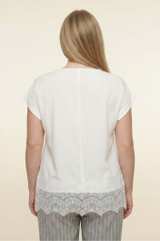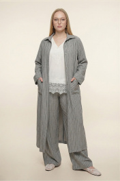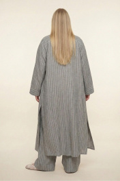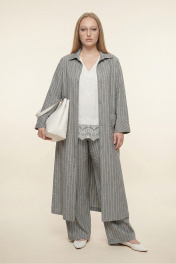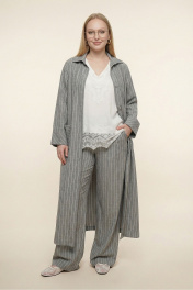 Комплект женский трёхпредметный из легкой ткани с добавлением льна. Туника свободного покроя с воротником рубашечного типа и застёжкой на петли с пуговицами. Рукава – точные с отрезанными манжетами. Спереди выполнены накладные карманы. В боковых швах – высокие разрезы. Брюки – прямые от бедра. Пояс – отрезной с эластичной тесьмой и кулисой со шнурком, позволяющей регулировать объем талии. В боковых швах имеются карманы. Топ – свободного покроя без рукавов. Вырез горловины – V-образной формы. Области горловины и внизу изделия декорировано французским кружевом.