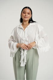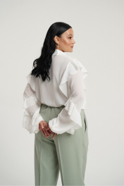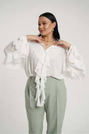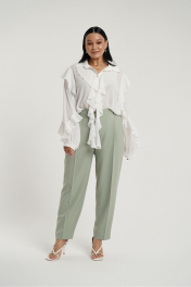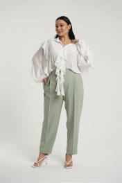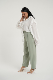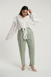 Брюки классические с стрелками слегка зауженные к низу. В боковых швах карманы с отрезным бочком. Застежка на молнию и петлю с пуговицей. Пояс отрезной с вставками эластичной тесьмы.