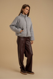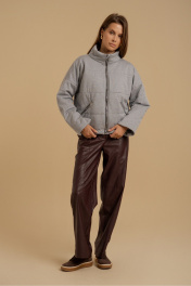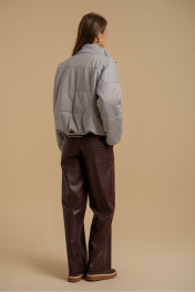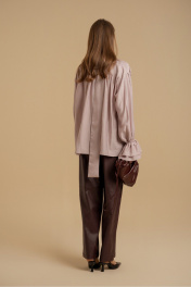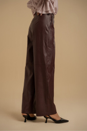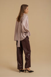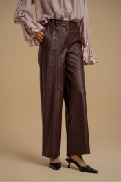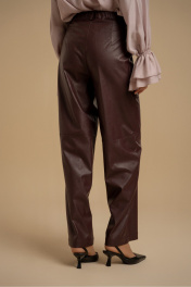 Брюки женские прямого силуэта из искусственной кожи на хлопковой основе. Пояс - отрезной с эластичной тесьмой и застежкой на брючный крючок. В боковых швах - карманы с отрезными бочками. Изделие декорировано подрезами. Есть шлевки для ремня.