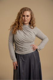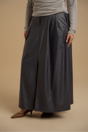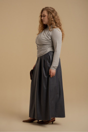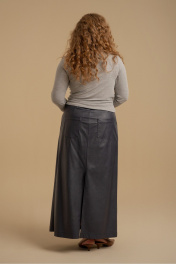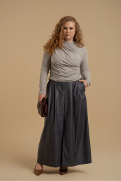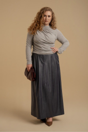 Юбка женская свободного силуэта из искусственной кожи на хлопковой подкладке. Пояс - отрезной с эластичной тесьмой. В боковых швах имеются карманы. Спереди выполнены мягкие складки. В средних швах спинки и переда - разрезы. Юбка посажена на подкладку. Есть шлевки для ремня.
