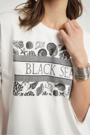 Блуза свободного покроя со спущенным рукавом. Вырез горловины- неглубокий округлой формы, с отрезной планкой. Перед декорирован печатью.