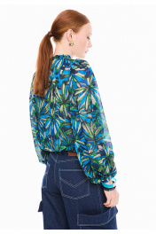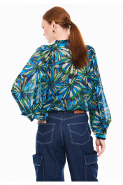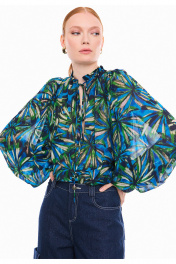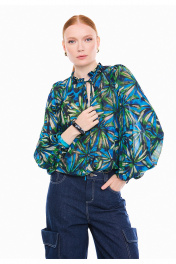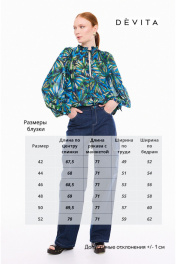 Блуза из итальянской принтованной вискозы, прямого кроя, с разрезами в боковых швах. Перед с разрезом до линии груди с завязками в верхней части. По горловине небольшая стойка - рюша. Узкая линия плечевого шва. Рукава одношовные, широкие, со сборкой в верхней и нижней части. По низу рукава узкий манжет. Изысканный принт блузки привнесет в гардероб нотку шика.