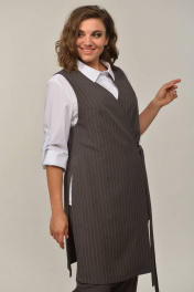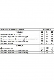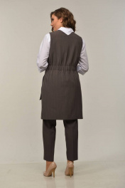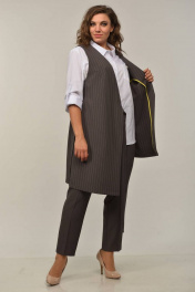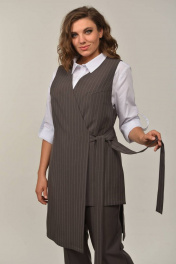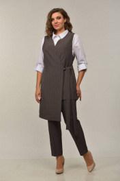 Комплект брючный с жилеткой. Жилетка удлинённая с ассиметричной длиной полочек. По полочкам нагрудные вытачки от проймы. Спинка с кулисой в области талии. Горловина V-образной формы со смещённой застёжкой на потайную кнопкуи пояса - завязки. По боковым швам разрезы отстрочены отделочной строчкой на 20 см. Брюки классические зауженные к низу со стрелками. Застёжка - молния спереди. Пояс застёгивается на 2 петли и пуговицы. Длина по спинке от плеча жилетки 94 см., длина брюк 100 см.