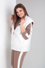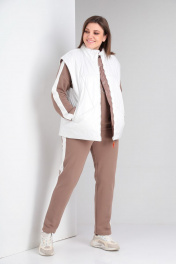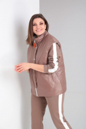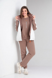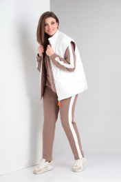 Комплект брючный(кофта+брюки+жилетка).Кофта прямого силуэта со спущенным плечом , рукав втачной одношовный с притачным манжетом, по низу изделия притачной пояс. Горловина обработана бейкой. По плечевому шву и рукаву лампас из отделочной ткани. Брюки прямые,верхний срез обработан поясом с резинкой и шнуром. По боковым швам лампас из отделочной ткани. Жилетка полуприлегающего силуэта с центральной застёжкой на тесьму-молнию,двусторонняя обработаны прорезные карманы с листочкой и накладные карманы с другой стороны. Используется две ткани. В качестве отделки используется отделочная строчка ,фурнитура,вышивка. Длина по спинке жилетки 66 см, длина по спинке кофты 66 см. длина рукава 48 см., длина брюк 109 см.