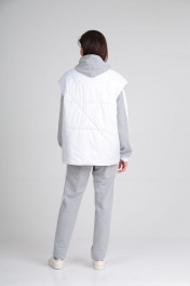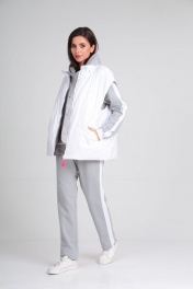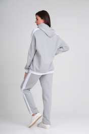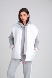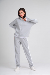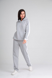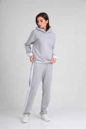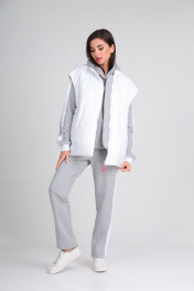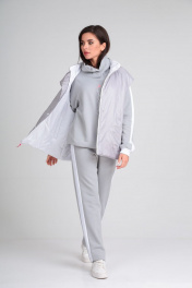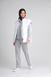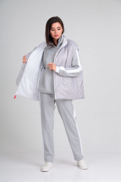 Комплект брбючный(кофта+брюки+жилетка).Кофта прямого силуэта со спущенным плечом, рукав втачной одношовный с притачным манжетом, по низу изделия притачной пояс. Горловина обработана бейкой (капюшон). По плечевому шву и рукаву лампас из отделочной ткани. Брюки прямые,верхний срез обработан поясом с резинкой и шнуром. По боковым швам лампас из отделочной ткани. Жилетка полуприлегающего силуэта с центральной застёжкой на тесьму-молнию,двусторонняя обработаны прорезные карманы с листочкой и накладные карманы с другой стороны. Используется две ткани. В качестве отделки используется отделочная строчка, фурнитура, вышивка. Длина по спинке жилетки 66 см, длина по спинке кофты 66 см, длина рукава 48 см, длина брюк 109 см.