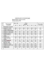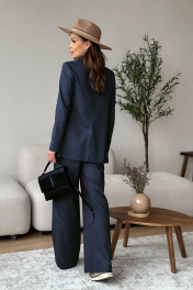 Костюм женский, состоящий из жакета и брюк. Жакет свободного силуэта длиной ниже линии бедер. Спинка со швом. Жакет с центрально-бортовой застежкой на 2 петли и пуговицы. Перед с нагрудными вытачками из бокового шва и наклонными рельефами, заканчивающимися на уровне кармана «в рамку». Ниже параллельно карману настрочен клапан. Воротник пиджачного типа с отложными лацканами. Рукава втачные двухшовные; по низу рукава обработана закрытая шлица с 4-мя пуговицами. Перед жакета на подкладке. Брюки - палаццо с застежкой на тесьму-молнию с гульфиком и откоском в среднем шве. Брюки на притачном поясе со шлевками и застежкой на одну прорезную петлю и пуговицу. Задняя часть пояса - на резинке. ЗП брюк с талиевыми вытачками. ПП брюк с двумя фиксированными складками и боковыми карманами. Длина жакета - 72,5 см - 73,7 см Длина рукава жакета - 62 см Длина брюк - 115,4 см