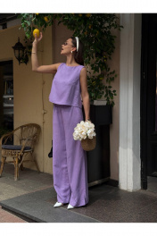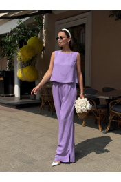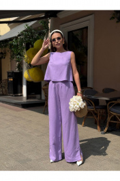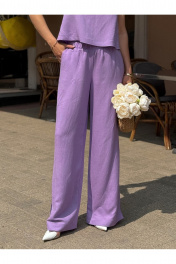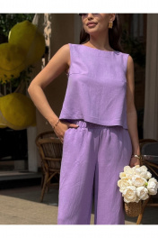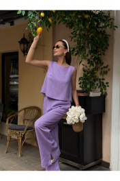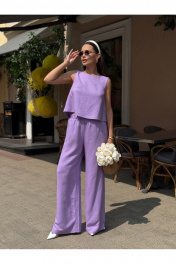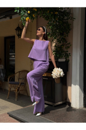 Костюм женский двух-предметный, состоящий из брюк и блузы. Брюки прямого широкого силуэта. По ПП брюк обработаны косые боковые карманы. Брюки обработаны поясом с резинкой. Блуза прямого силуэта, укороченная. Перед с нагрудными вытачками из бокового шва. Спинка состоит из двух частей, которые между собой завязываются на шнурки. Вырез горловины «лодочка» Ширина плеча блузы — 6,6 — 7,4 см Длина блузы — 45,5 — 48,5 см Длина брюк — 111 см