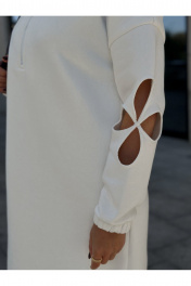 Платье прямого силуэта, немного выше линии колена. Платье со спущенной линией плечевого шва. Спинка со средним швом. Перед с застежкой на тесьму молнию, не доходящей до талии. Рукава на основе цельнокроеного, с резинкой по низу и декоративно вырезанным и окантованным цветком по середине рукава. Воротник стойка. По горловине и вокруг молнии проложена отделочная строчка. Длина рукава – 42,9 – 41,3 см. Длина платья – 92-94 см.
