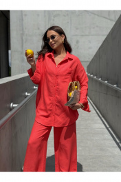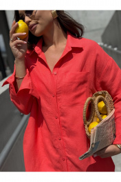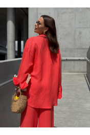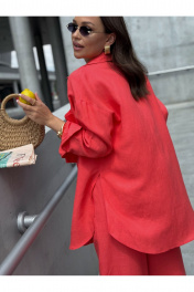 Блузка с центральной застежкой и планками на 7 прорезных петель и пуговиц. Перед – с нагрудными вытачками и накладным карманом на левой полочке. Спинка без конструктивных элементов. Рукава рубашечного типа с притачной манжетой, застегивающиеся на 2 прорезные петли пуговицы, с разрезом. Воротник рубашечного типа с отрезной стойкой, застегивающейся на 1 прорезную петлю и пуговицу. По бокам – разрезы до талии. Линия низа – округлая. Длина рукава – 48,5 – 49,5 см Длина блузки – 121,5 см.