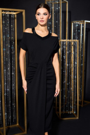 Платье женское из трикотажной ткани полуприлегающего силуэта, отрезное по линии талии. Лиф с цельнокроеными рукавами, с припущенными плечами. Спинка лифа со средним швом. Юбка, зауженная к низу. Задняя часть со средним швом и талевыми вытачками. Передняя часть асимметричная, правая отлетная часть прячет декоративный шов со сборкой. Внизу декоративный разрез. Горловину украшает деталь из пайеток.