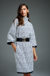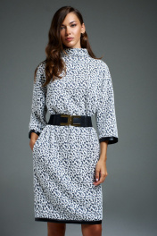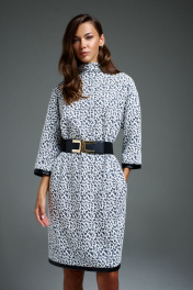 Платье женское трикотажное прямого кроя. Линия плеча спущенна. Рукав укороченный. Воротник-стойка цельнокраеный. По низу изделия и рукавов выполнены притачные планки из "экокожи". В комплекте декоративный пояс на пряжке.