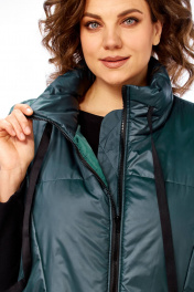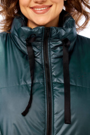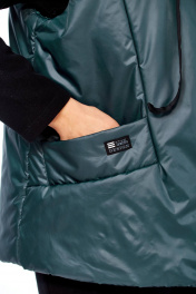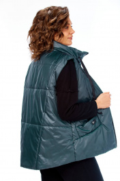 Жилетка женская утепленная с центральной застежкой на "молнию". Спинка со стяжкой. Перед с отрезными бочками и боковыми карманами "с листочкой". Воротник стойка с кулисой и шнуром из декорированной тесьмы. Низ жилетки округлой формы спереди короче, а спинка длиннее . Правый карман украшен нашивкой.