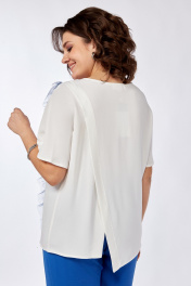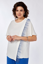 Комплект брючный состоит из блузы и брюк. Блуза свободного кроя с спущенной линией плеча и ассиметричным низом. Перед с косой складкой от левого плеча до низа, из-под которого выходит двойная рюша из фатина. Спинка с косой складкой от левого плеча до низа. Горловина округлой формы. Брюки прямые свободного кроя, сверху на резинке.