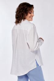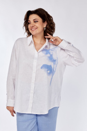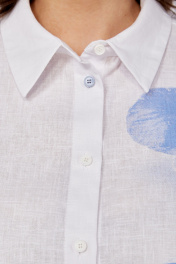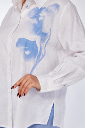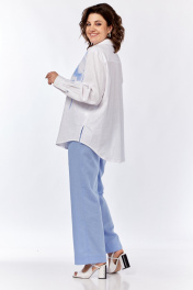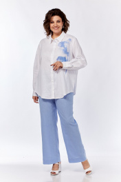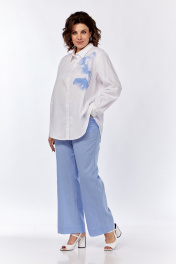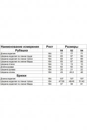 Комплект брючный состоит из рубашки и брюк. Рубашка прямого силуэта с центральной застежкой на петли и пуговицы. По спинке кокетка, по шву притачивания заложена встречная складка. Рукав втачной одношовный с притачным манжетом с застежкой на петли и пуговицы. Воротник стояче-отложной с отрезной стойкой. На левой центральной части переда -печать. Брюки прямые. Верхний срез обработан поясом с резинкой, застежка на молнию, пояс с петлей и пуговицей, в боковых швах обработаны карманы.