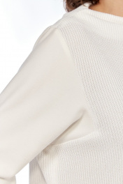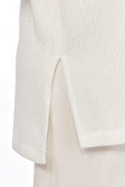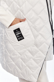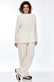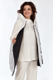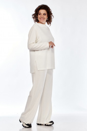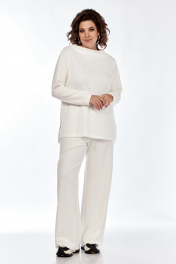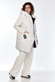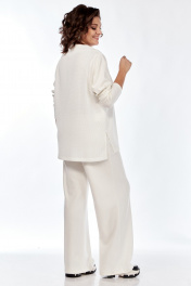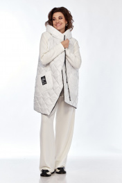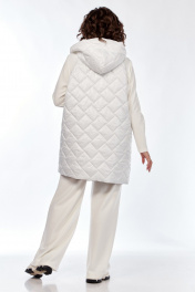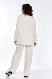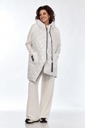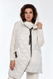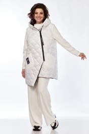 Комплект брючный (тройка). Кофта прямого силуэта, по боковым швам разрезы, пройма квадратная, рукав втачной одношовный, стойка цельнокроенная. Брюки широкие, верхний срез обработан поясом с резинкой. Жилетка расширенная к низу, со смещенной застежкой на тесьму-молнию, ассиметричный низ. Накладные карманы, широкая пройма. Капюшон с отделочной деталью по отлету. В качестве отделки используется фурнитура.