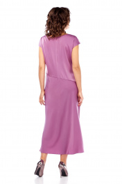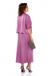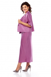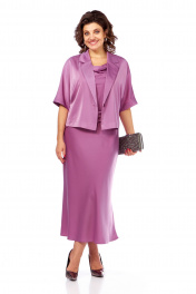 Комплект женский, состоит из платья и жакета. Жакет укроченный свободного кроя с застежкой на 1 петлю и пуговицу. Воротник пиджачного типа с лацканом. Рукав цельнокройный длиной 3/4. Платье полуприлегающего силуэта, чуть расклешенное к низу. Перед с косым подрезом и мягкими складками в области талии. Горловина в виде "качели". Пройма соспущенной линией плеча. Спинка со средним швом и потайной молнией до подреза. В области талии косой подрез. Длина жакета по спинке 51 см, ширина плеча + длина рукава 43 см. Длина платья по спинке 126 см.