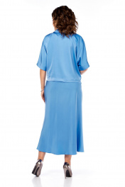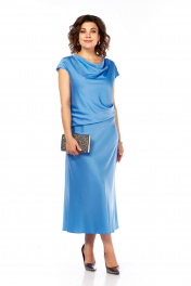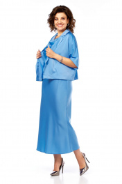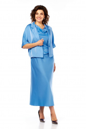 Комплект женский, состоит из платья и жакета. Жакет укроченный свободного кроя с застежкой на 1 петлю и пуговицу. Воротник пиджачного типа с лацканом. Рукав цельнокройный длиной 3/4. Платье полуприлегающего силуэта, чуть расклешенное к низу. Перед с косым подрезом и мягкими складками в области талии. Горловина в виде "качели". Пройма соспущенной линией плеча. Спинка со средним швом и потайной молнией до подреза. В области талии косой подрез. Длина жакета по спинке 51 см, ширина плеча + длина рукава 43 см. Длина платья по спинке 126 см.