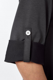 Платье женское полуприлегающего силуэта. Спинка со средним швом. Перед с печатью в виде надписей вдоль горловины и левого бока внизу. Рукав длиной 3/4 с отворотом и хлястиком . Воротник-капюшон с кулисой и шнурком. По внешнему краю кант из отделочной ткани. По боковым швам обработаны разрезы так же с кантом из отделочной ткани.
