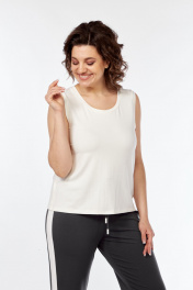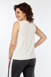 Комплект брючный (жакет+майка+брюки). Жакет полуприлегающего силуэта с центральной застежкой на петли и пуговицы. По спинке средний шов со шлицей. По переду вытачки, накладные карманы. Воротник стояче-отложной с открытыми бортами. Рукав втачной 2-шовный с лампасом переходящим на плечевой. Жакет без подкладки. Майка полуприлегающего силуэта. Горловина и пройма обработаны бейками. Брюки прямые. верхний срез обработан поясом с резинкой со шнурком. По боковому шву лампас. Используется три ткани. В качестве отделки используется печать.