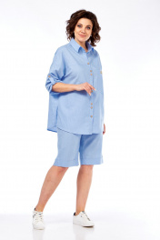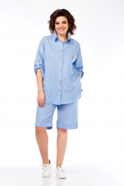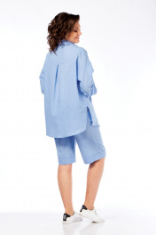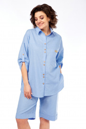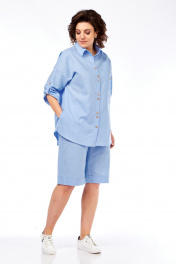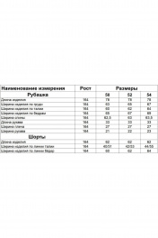 Комплект женский состоит из рубашки и шорт. Рубашка свободного кроя с центральной застежкой на птели и пуговицы по переду, и спинке кокетке. По спинке заложена вытачная складка. По переду накладные карманы. Плечо спущенное, рукав втачной одношовный. ДЛина рукава регулируется с помощью хлястика. По боковым швам разрезы. Воротник стояче-отложной с отрезной стойкой. Шорты прямые, по переду карманы в боковых швах. По задней части кокетка и накладыне карманы. Верхний срез обработан поясом с резинкой, вставлены шлевки. По низу манжеты. В качестве отделки используется фурнитура.