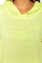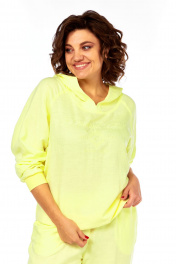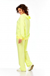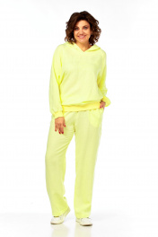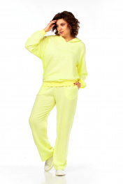Комплект брючный состоит из кофты и брюк. Кофта прямого силуэта. По горловине капюшон. По низу изделия и рукава-манжеты из отделочной ткани -довяз. В качестве отделки используется вышивка на центральной части переда. Брюки прямые, верхний рсез обработан резинкой. В боковых швах обработаны карманы. Длина по спинке 67 см, длина рукава 72 см. Длина брюк 107 см.