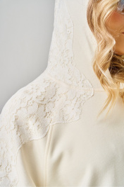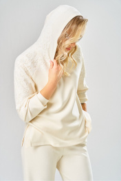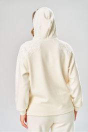 Комплект брючный состоит из кофты и брюк. Кофта свободного кроя покроя реглан. По низу рукава манжет. Капюшон с центральным швом. По боковым швам разрезы. В качестве отделки используется кружево по рукаву и капюшону. Брюки широкие, в боковых швах обработаны карманы. Верхний срез обработан поясом с резинкой. Длина кофты по спинке 65 см, длина рукава 70 см. Длина брюк 109 см.