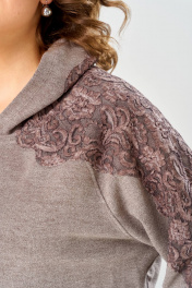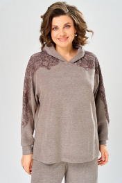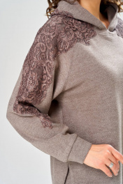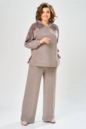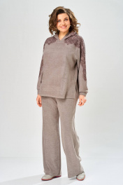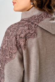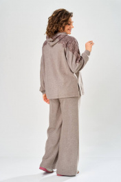 Комплект брючный состоит из кофты и брюк. Кофта свободного кроя покроя реглан. По низу рукава манжет. Капюшон с центральным швом. По боковым швам разрезы. В качестве отделки используется кружево по рукаву и капюшону. Брюки широкие, в боковых швах обработаны карманы. Верхний срез обработан поясом с резинкой. Длина кофты по спинке 65 см, длина рукава 70 см. Длина брюк 109 см.