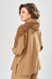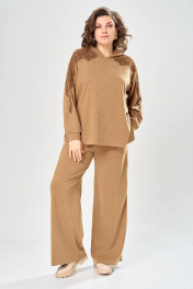 Комплект брючный состоит из кофты и брюк. Кофта свободного кроя покроя реглан. По низу рукава манжет. Капюшон с центральным швом. По боковым швам разрезы. В качестве отделки используется кружево по рукаву и капюшону. Брюки широкие, в боковых швах обработаны карманы. Верхний срез обработан поясом с резинкой. Длина кофты по спинке 65 см, длина рукава 70 см. Длина брюк 109 см.