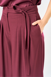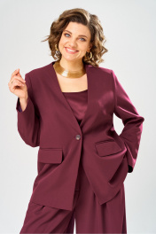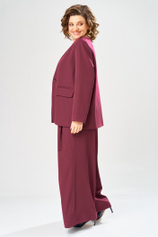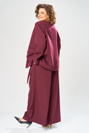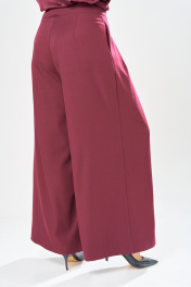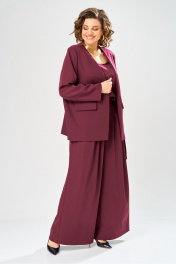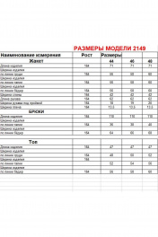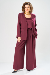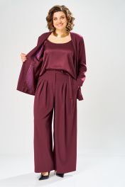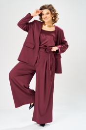 Комплект брючный состоит из жакета, топа и брюк. Жакет прямого силуэта с застежкой на петлю и пуговицу. Спинка со средним швом. Перед с боковыми карманами с клапаном. Рукав втачной 2-х шовный. Горловина V-образной формы. Жакет на подкладке. Топ из отделочной ткани с вытачками по переду и бретельками с регулировкой длины. Брюки прямые широкие с карманами в боковых швах, по переду застрочены складки и молния. Пояс по спинке на резинке, по переду с завязками. Длина жакета по спинке 71 см, длина рукава 62 см. Длина топа по спинке 47 см. Длина брюк 110 см.
