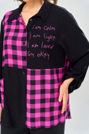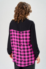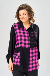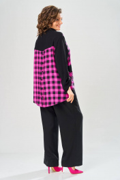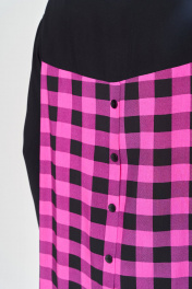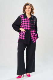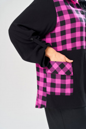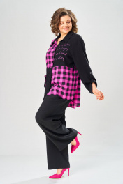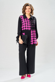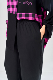 Комплект брючный состоит из блузы-рубашки и брюк.. Рубашка выполнена из 2-ух видов х/б ткани: черной и в клетку. Спинка с плечевой кокеткой и имитацией застежки в нижней части из отделочной ткани. Перед с подрезом в области талии и 1 накладным карманом в нижней части правой полочки. Застежка на 7 петель и пуговиц. Рукав втачной, одношовный с хлястиком для регулировки длины. Воротник на стойке. Брюки прямые широкие с карманами в боковых швах и поясом на резинке. Длина по спинке 83 см, длина рукава 63 см. Длина брюк 106 см