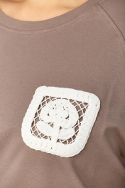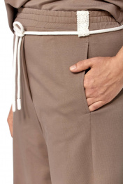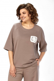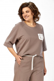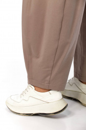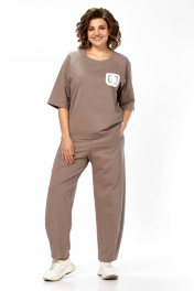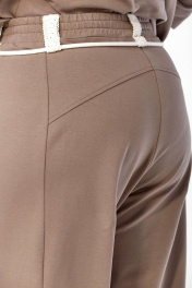 Комплект брючный состоит из майки и брюк. Майка свободного кроя, рукав реглан длиной до линии локтя, горловина обработана бейкой, по переду отделочный карман. Брюки широкие с заужением к линии низа. На задней половинке-кокетка, отрезная боковая часть. В рельефном шве передней половинки-карманы. Верхний срез обработан поясом с резинкой. Шлевки из отделочной ткани, съемный шнур-пояс. В качестве отделки используются детали и фурнитура. Длина по спинке 65 см, гирина плеча+длина рукава 46 см. ДЛина брюк 105 см.